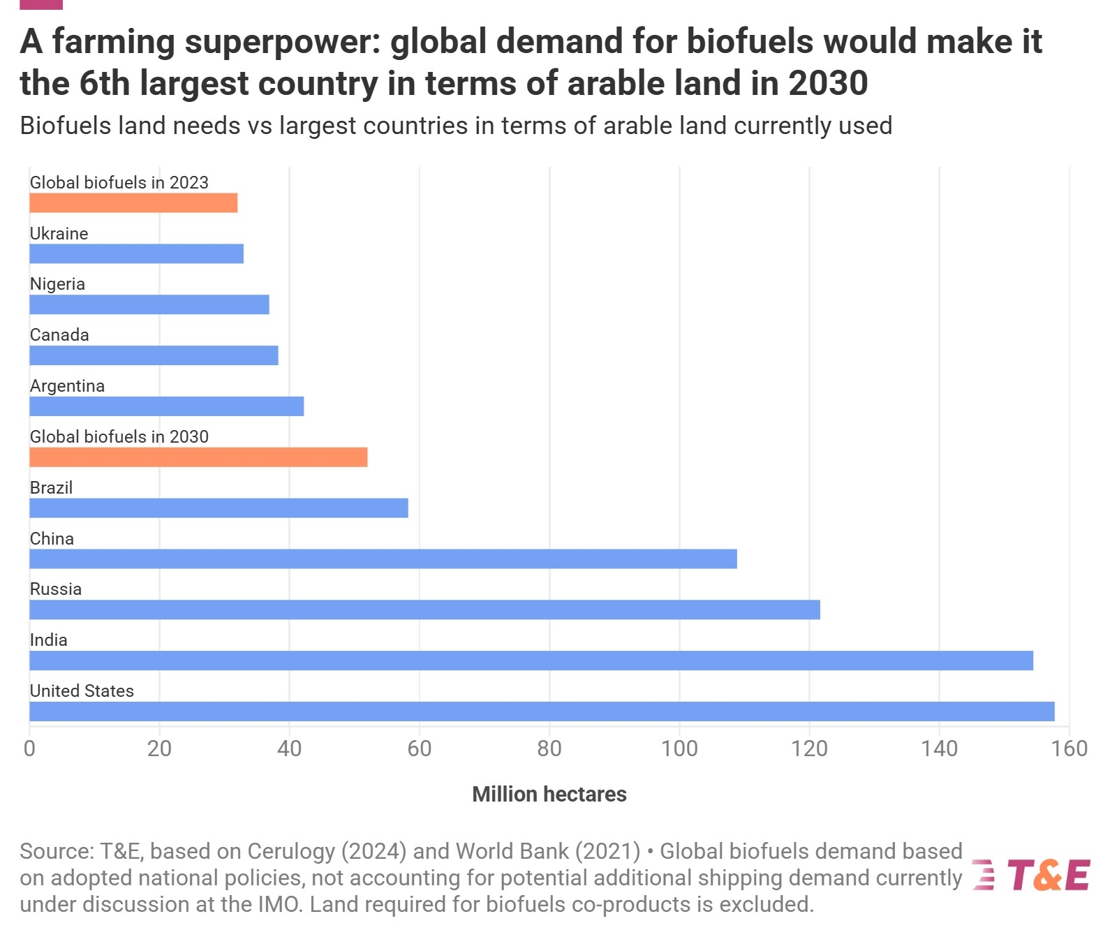 T&E’ye göre, birçok kişi biyoyakıtlardaki büyümenin, daha temiz atıklar ve kullanılmış yemeklik yağ ve hayvansal yağlar gibi gelişmiş hammaddelerdeki artıştan kaynaklanacağını iddia etse de, biyoyakıtların büyük çoğunluğu 2030 yılında da mahsullerden gelmeye devam edecek. Deniz nakliyesi ve havacılıkta kullanımının artması bekleniyor