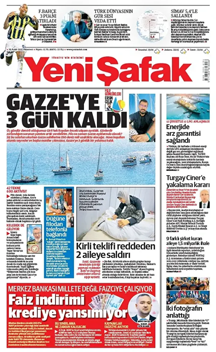 Yeni Şafak Gazetesi’nin 29 Eylül 2025 tarihli birinci sayfasında yer alan manşet ve haberler…