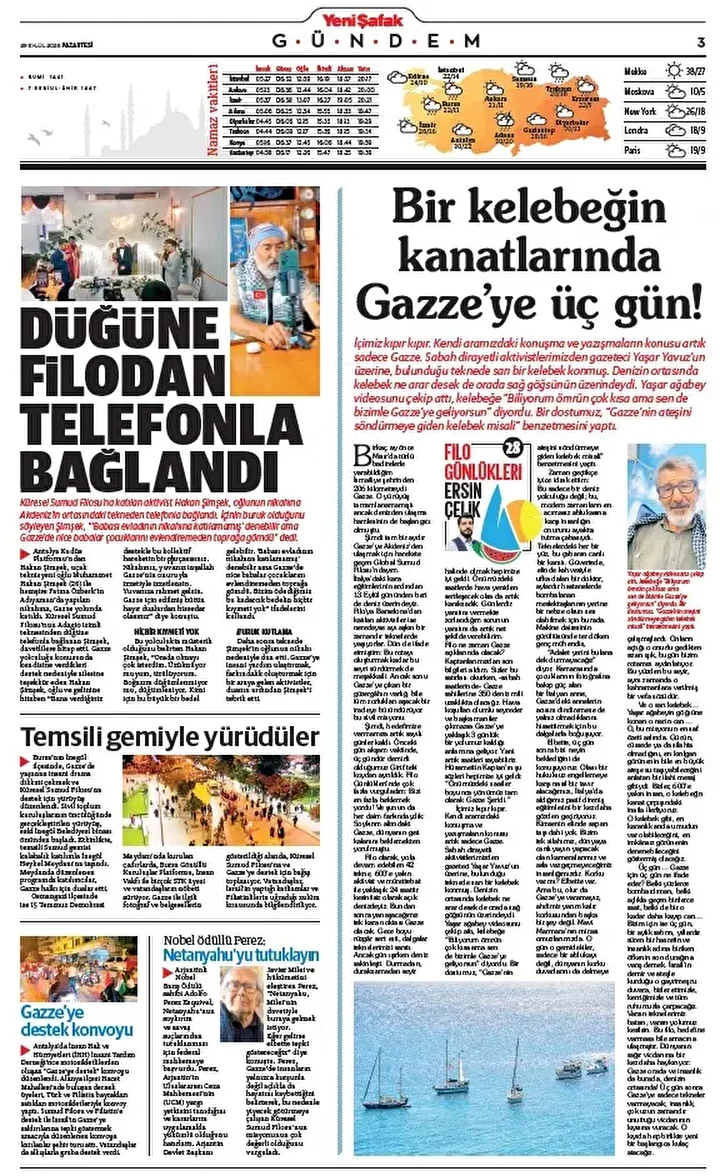 İçimiz kıpır kıpır. Kendi aramızdaki konuşma ve yazışmaların konusu artık sadece Gazze. Sabah dirayetli aktivistlerimizden gazeteci Yaşar Yavuz’un üzerine, bulunduğu teknede sarı bir kelebek konmuş. Denizin ortasında kelebek ne arar desek de orada sağ göğsünün üzerindeydi. Yaşar ağabey videosunu çekip attı, kelebeğe “Biliyorum ömrün çok kısa ama sen de bizimle Gazze’ye geliyorsun” diyordu. Bir dostumuz, “Gazze’nin ateşini söndürmeye giden kelebek misali” benzetmesini yaptı.