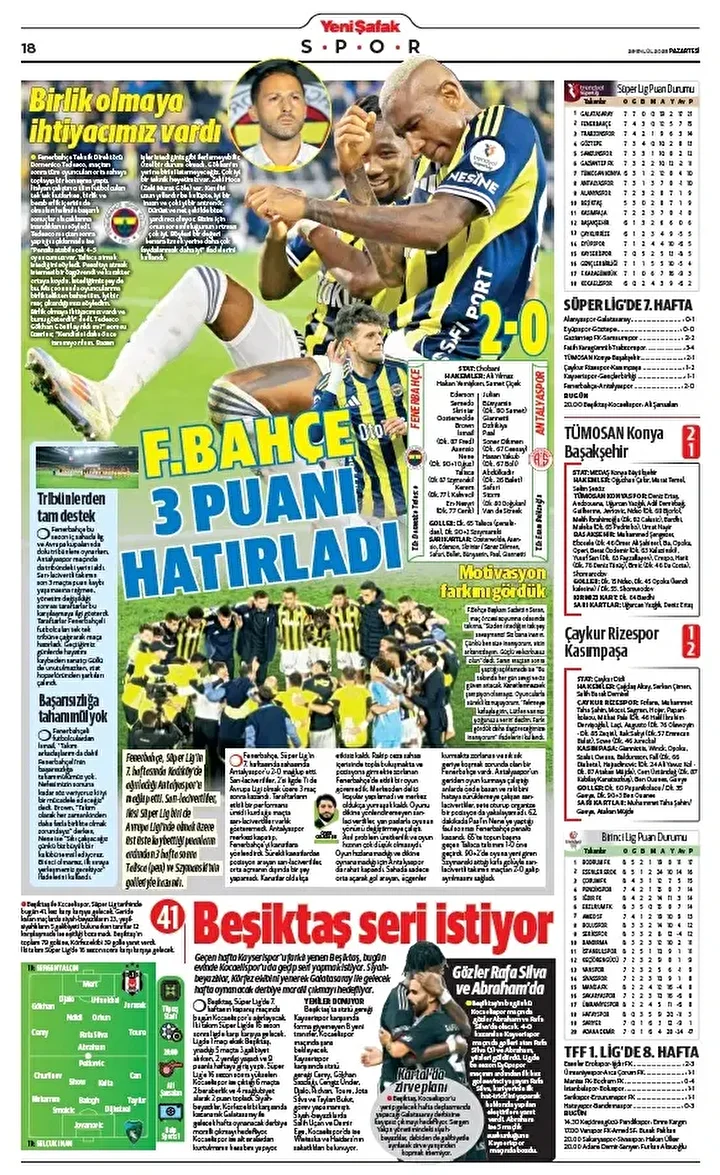 Fenerbahçe, Süper Lig’in 7. haftasında Kadıköy’de ağırladığı Antalyaspor’u mağlup etti. Sarı-lacivertliler, ikisi Süper Lig biri de Avrupa Ligi’nde olmak üzere üst üste kaybettiği puanların ardından 3 hafta sonra Talisca (pen) ve Szymanski’nin golleriyle kazandı.